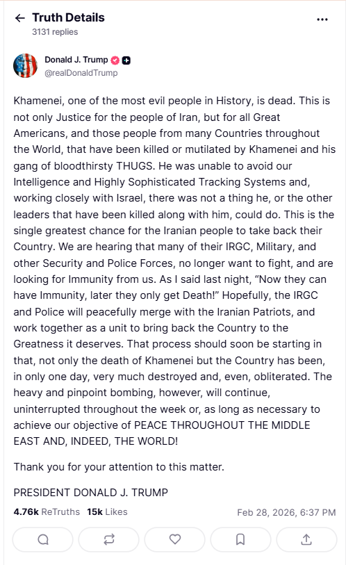 Khamenei, uma das pessoas mais perversas da história, está morto. Isso não é apenas justiça para o povo do Irã, mas para todos os grandes americanos e para aqueles de muitos países ao redor do mundo que foram mortos ou mutilados por Khamenei e sua gangue de bandidos sedentos de sangue. Ele não conseguiu escapar de nossa inteligência e de nossos sofisticados sistemas de rastreamento e, trabalhando em estreita colaboração com Israel, não havia nada que ele, ou os outros líderes que foram mortos junto com ele, pudessem fazer. Esta é a maior chance para o povo iraniano recuperar seu país. Estamos ouvindo que muitos de seus membros da Guarda Revolucionária Islâmica (IRGC), das Forças Armadas e de outras forças de segurança e policiais não querem mais lutar e estão buscando imunidade. Como eu disse ontem à noite: "Agora eles podem ter imunidade, depois só terão a morte!" Esperamos que a Guarda Revolucionária Islâmica e a Polícia se unam pacificamente aos patriotas iranianos e trabalhem juntos como uma unidade para trazer o país de volta à grandeza que ele merece. Esse processo deve começar em breve, visto que, não apenas com a morte de Khamenei, mas o país foi, em apenas um dia, amplamente destruído e até mesmo arrasado. Os bombardeios pesados ​​e precisos, contudo, continuarão ininterruptos durante toda a semana ou pelo tempo que for necessário para alcançarmos nosso objetivo de PAZ EM TODO O ORIENTE MÉDIO E, DE FATO, NO MUNDO!