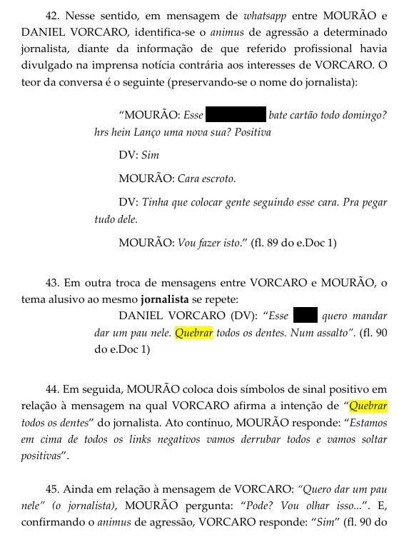 O nome do jornalista não aparece formalmente no processo, mas, conforme informou o jornal O Globo, o alvo mencionado nas conversas seria o colunista Lauro Jardim. A troca de mensagens teria ocorrido com Luiz Phillipi Machado de Moraes Mourão, apontado nas investigações como interlocutor do empresário. De acordo com os autos, Mourão questiona se poderia executar a ação e recebe uma resposta afirmativa.