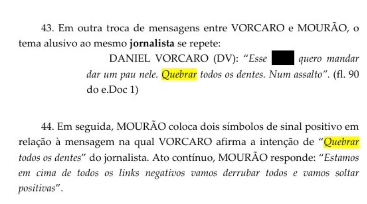 Segundo a decisão que embasou a prisão, diálogos encontrados em aplicativos de mensagens indicam que Vorcaro teria autorizado a realização de agressões físicas contra um profissional da imprensa. Em uma das conversas citadas na investigação, o empresário menciona a intenção de “mandar dar um pau” e “quebrar todos os dentes” de um jornalista, sugerindo ainda que a ação fosse encenada como um assalto.