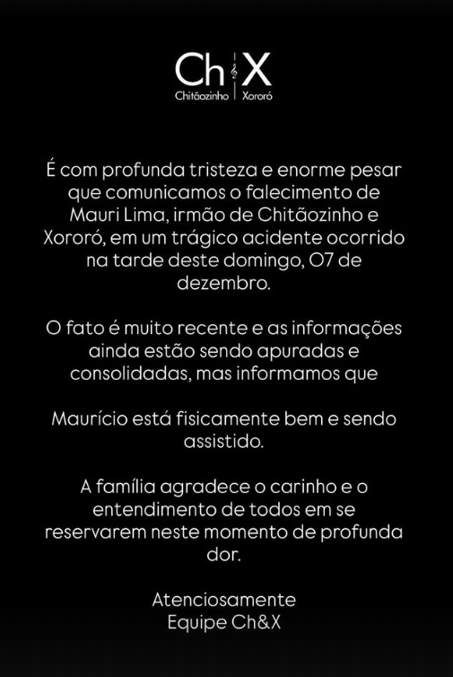 “É com profunda tristeza e enorme pesar que comunicamos o falecimento de Mauri Lima, irmão de Chitãozinho e Xororó, em um trágico acidente ocorrido na tarde deste domingo”.