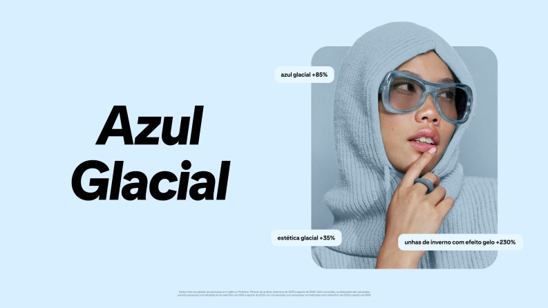 O Azul Glacial aparece como símbolo de foco, frescor e clareza mental. Associado a estéticas minimalistas e tecnológicas, o tom cresce em buscas relacionadas a moda, beleza e design de interiores.