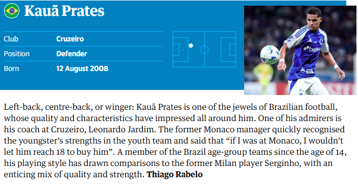 “Lateral-esquerdo, zagueiro ou ponta: Kauã Prates é uma das joias do futebol brasileiro, cuja qualidade e características impressionam a todos ao seu redor. Um de seus admiradores é seu técnico no Cruzeiro, Leonardo Jardim. O ex-treinador do Monaco reconheceu rapidamente os pontos fortes do jovem nas categorias de base e disse: ‘Se eu estivesse no Monaco, não deixaria ele chegar aos 18 anos para comprá-lo’. Integrante das seleções de base do Brasil desde os 14 anos, seu estilo de jogo atraiu comparações com o ex-jogador do Milan, Serginho, com uma mistura atraente de qualidade e força.”