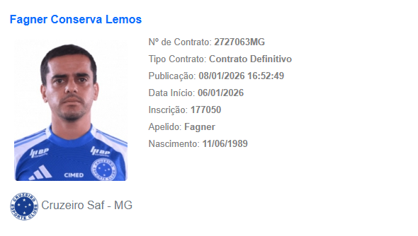 Nesta quinta-feira (8), o Boletim Informativo Diário (BID) da CBF publicou o contrato definitivo do lateral-direito Fagner com o Cruzeiro.
