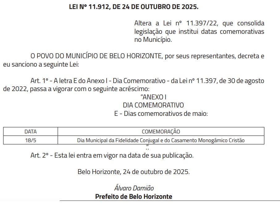 Belo Horizonte tem uma nova data comemorativa no calendário oficial: o Dia Municipal da Fidelidade Conjugal e do Casamento Monogâmico Cristão. O prefeito Álvaro Damião (União) sancionou, nessa sexta-feira (24/10), o projeto de lei proposto pelo vereador Neném da Farmácia (Mobiliza).