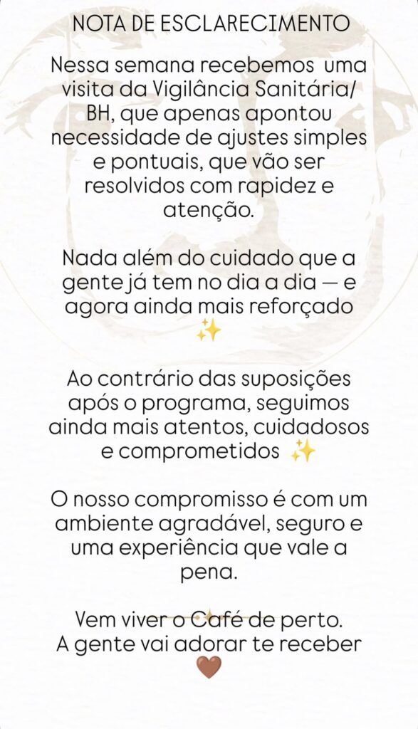 O Café Cultura Bar também comentou sobre especulações relacionadas à casa depois da passagem pelo programa. “Ao contrário das suposições após o programa, seguimos ainda mais atentos, cuidadosos e comprometidos”. “O nosso compromisso é com um ambiente agradável, seguro e uma experiência que vale a pena”, reforçou o bar.