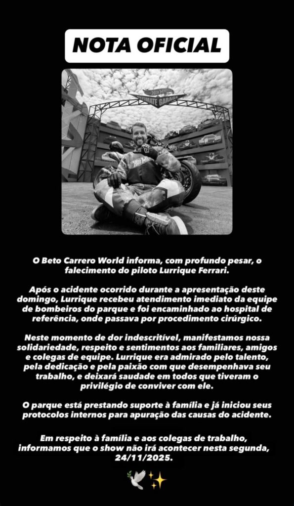 “O Beto Carrero World informa, com profundo pesar, o falecimento do piloto Lurrique Ferrari. Após o acidente ocorrido durante a apresentação deste domingo, Lurrique recebeu atendimento imediato da equipe de bombeiros do parque e foi encaminhado ao hospital de referência, onde passava por procedimento cirúrgico.”