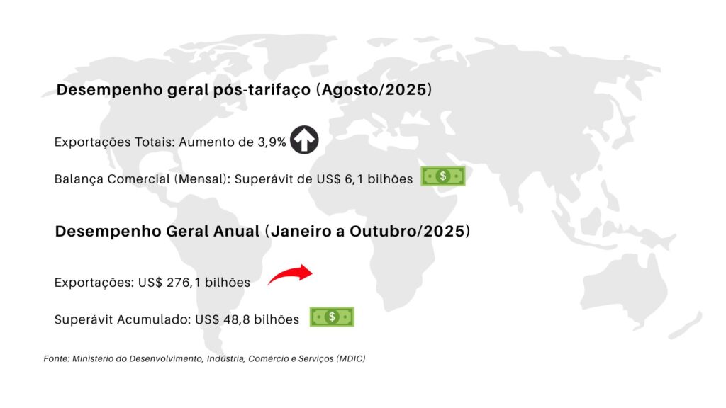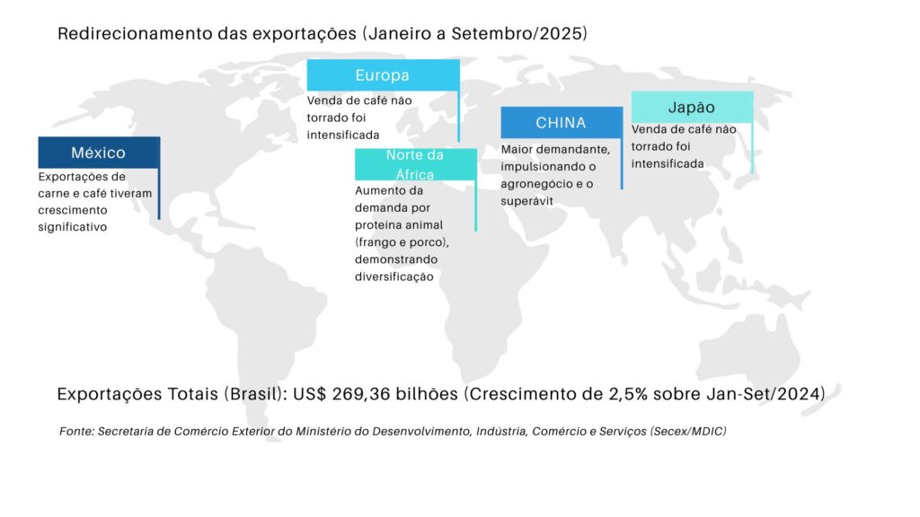 O pulso firme do Brasil e a crise comercial global abriram caminho para um redirecionamento eficiente das exportações. Parcerias comerciais já estabelecidas foram fortalecidas, e a demanda de países como a China e o México ajudou a compensar as perdas no mercado americano.