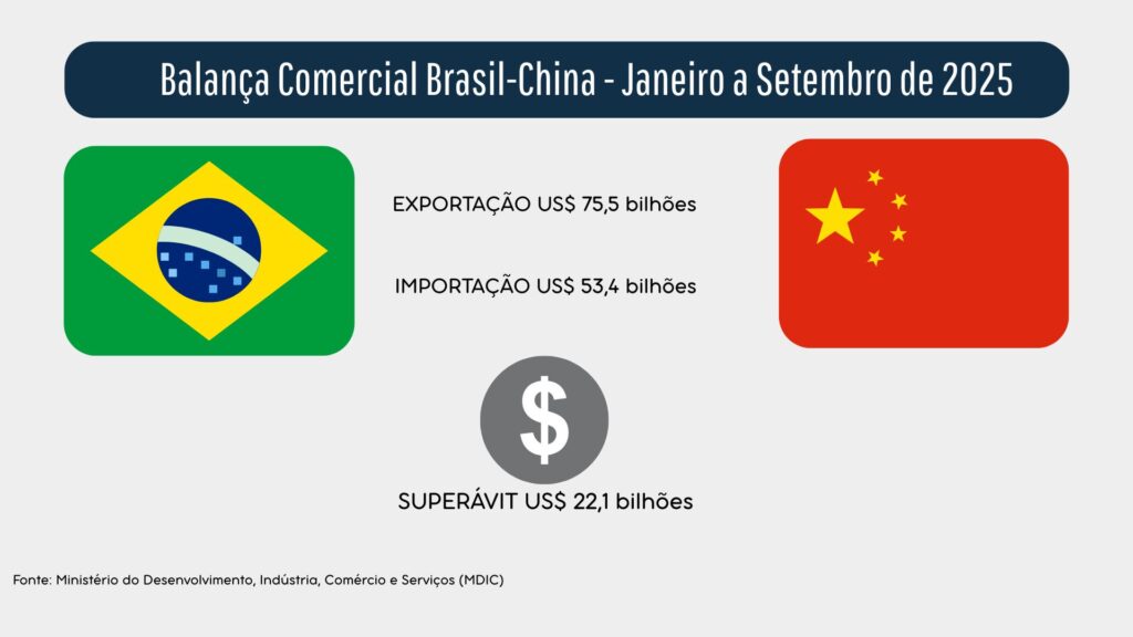 A China, principal parceiro comercial, continuou sendo o motor do comércio exterior brasileiro. A relação bilateral, baseada na exportação de commodities (soja, minério de ferro, petróleo) em troca de tecnologia e fertilizantes, gerou um superávit histórico para o Brasil: