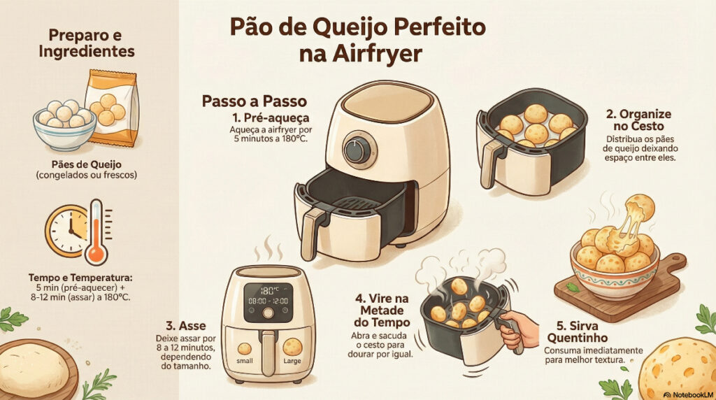O tempo médio de preparo varia entre 8 e 12 minutos, dependendo do tamanho do pão de queijo e da potência do equipamento. Durante o processo, recomenda-se abrir o cesto na metade do tempo para virar ou sacudir levemente as unidades, garantindo um dourado uniforme.
