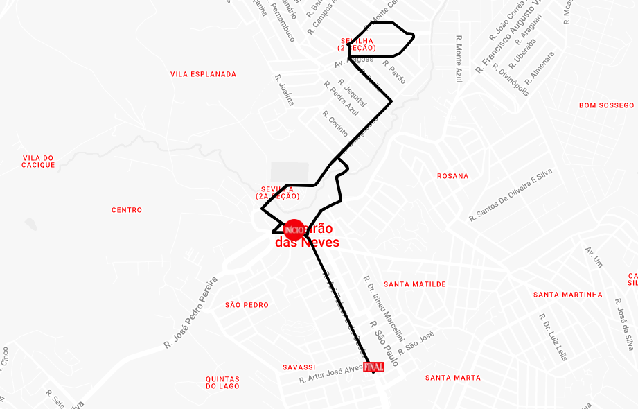 Endereço: Saída no Monte Carmo Shopping (Avenida Juiz Marco Túlio Isaac, 1119) e chegada ao bairro Filadélfia (Avenida Bandeirantes).