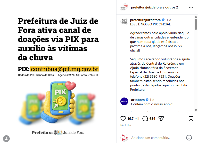 A Prefeitura de Juiz de Fora e de Ubá, as cidades mais afetadas pelas chuvas, disponibilizou um PIX oficial para doações financeiras. Os valores arrecadados são destinados às ações emergenciais de apoio às famílias atingidas.
