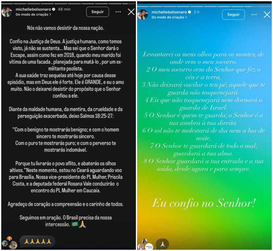 No story, Michelle também transcreveu trechos do Salmo 121, da Bíblia. “O Senhor te guardará de todo o mal; guardará a tua alma. O Senhor guardará a tua entrada e a tua saída, desde agora e para sempre”, escreveu.