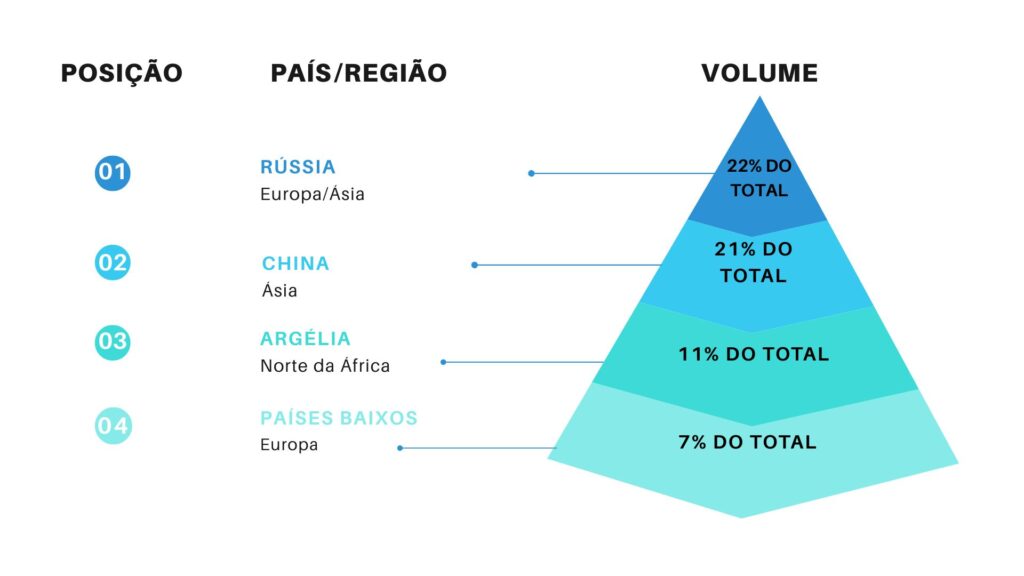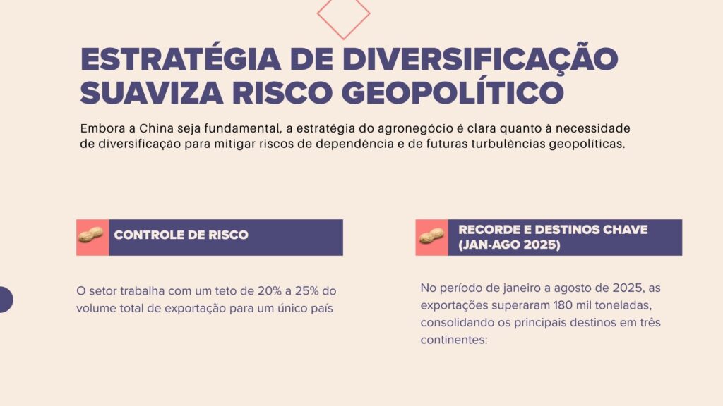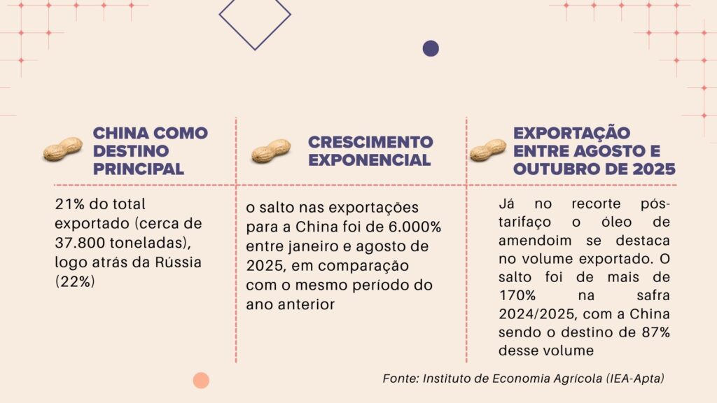 As exportações de óleo de amendoim tiveram um aumento de mais de 170% na safra 2024/2025, com a China (87% do volume) e a Itália (13%) sendo os maiores compradores, reforçando a importância da indústria de processamento brasileira.