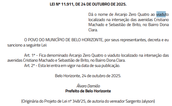 O viaduto no cruzamento das avenidas Cristiano Machado e Sebastião de Brito, no bairro Dona Clara, em Belo Horizonte, passa a se chamar, a partir deste sábado (25/10), Arcanjo Zero Quatro. O nome homenageia as seis pessoas que morreram na queda de um helicóptero do Corpo de Bombeiros em Ouro Preto, em outubro de 2024.